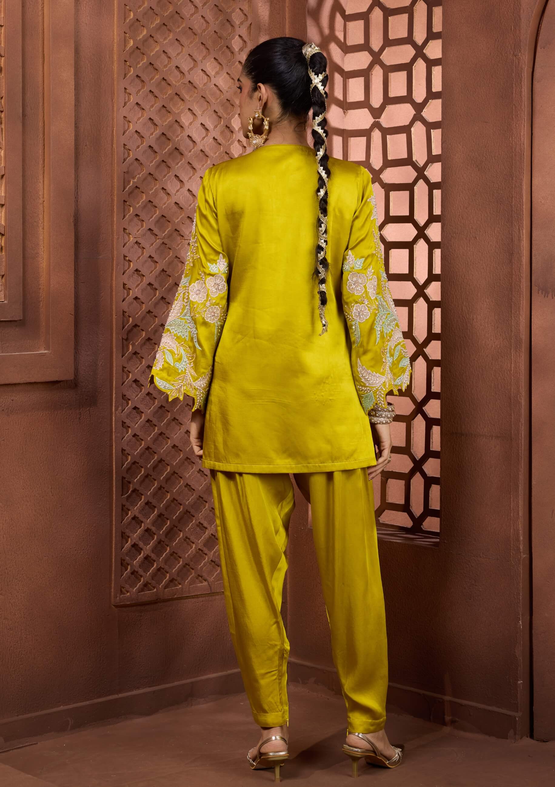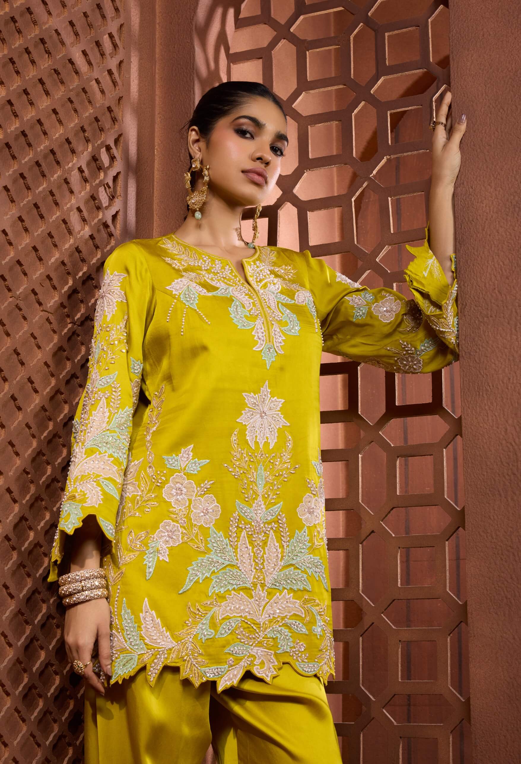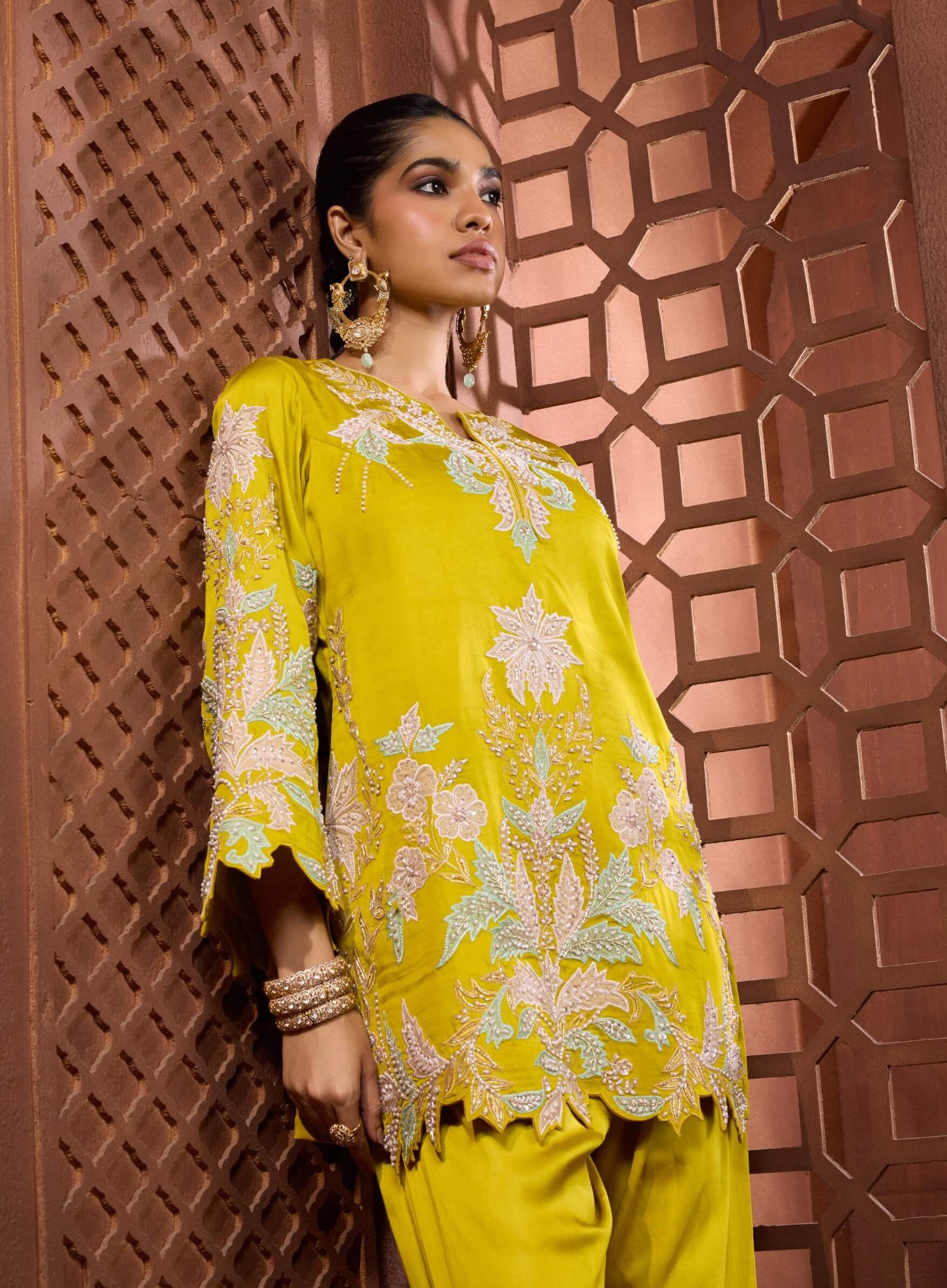 A fresh burst of colour with contemporary finesse, the zaituni gulzar set glows in radiant chartreuse tones. The short kurta is adorned with oversized pastel floral embroidery highlighted with pearls, sequins, and bugle beadwork. Finished with a scalloped hem and paired with a tapered skinny salwar, it offers a vibrant silhouette. Ideal for high-end festive occasions and celebratory gatherings.