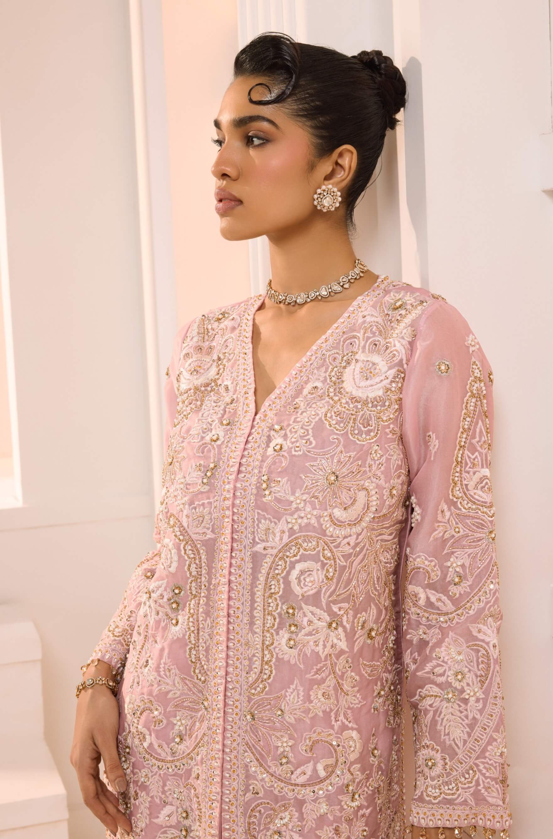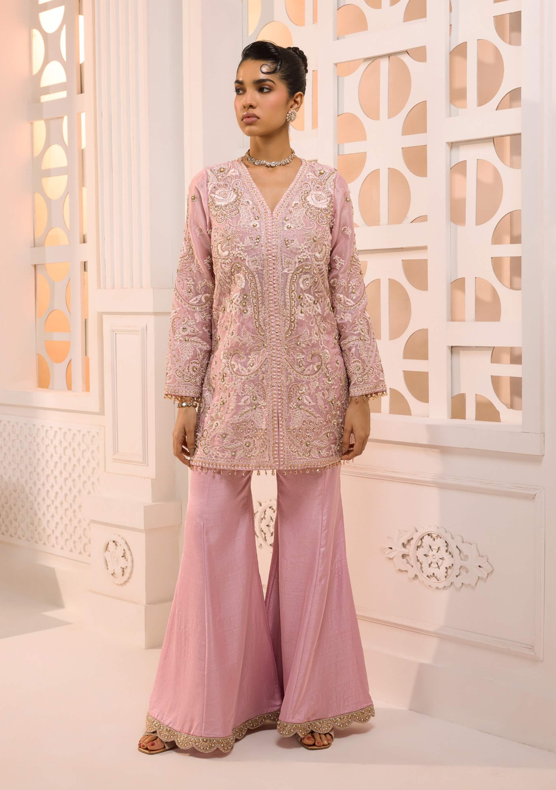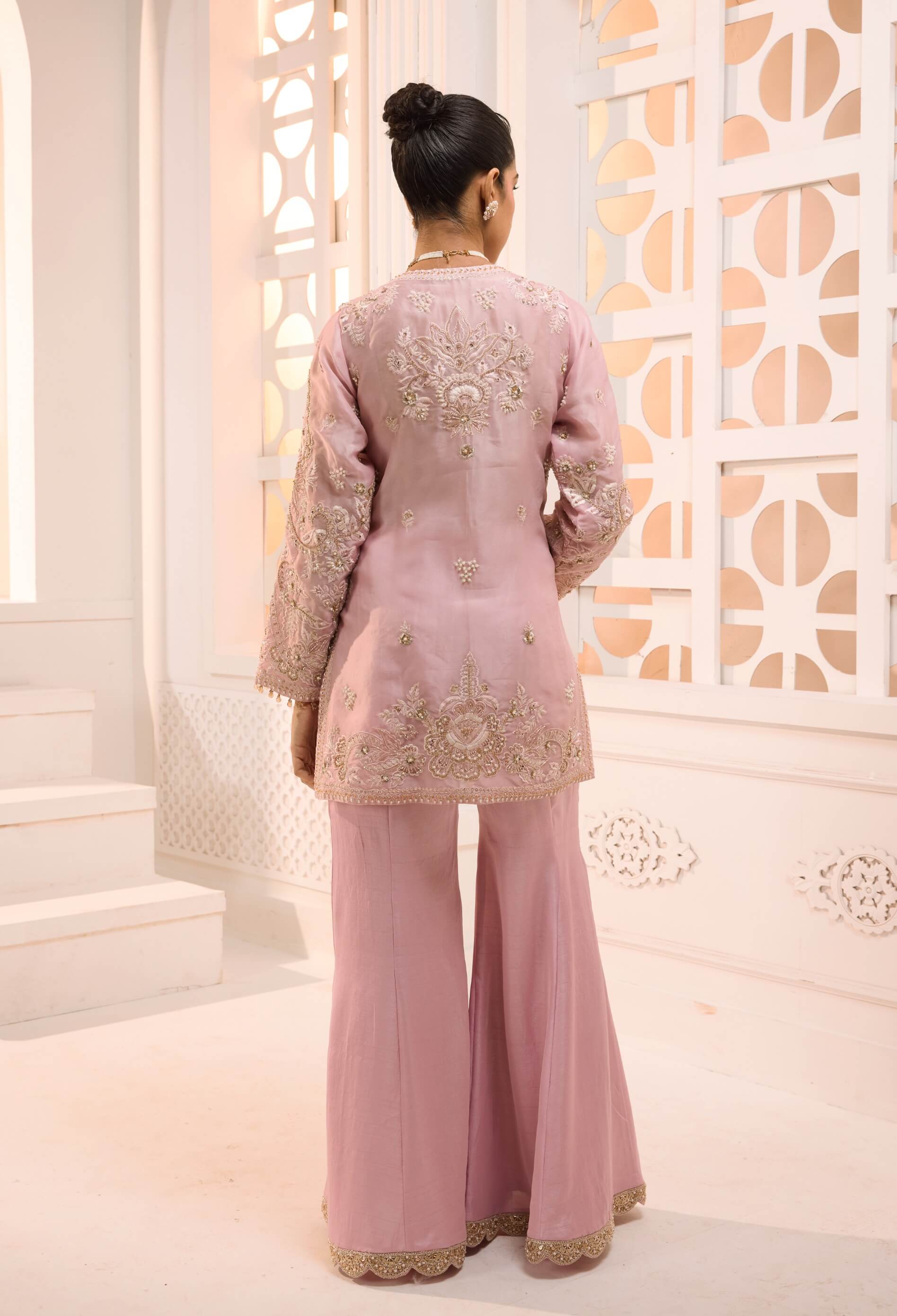 A vision of blush elegance, the zoya set features a hand-embroidered jacket-style organza kurta with refined pearl, sequin, and beadwork detailing. Paired with a flowing flared sharara finished with a scalloped border, it creates a graceful silhouette. Designed for effortless sophistication. Perfect for festive gatherings and weddings.